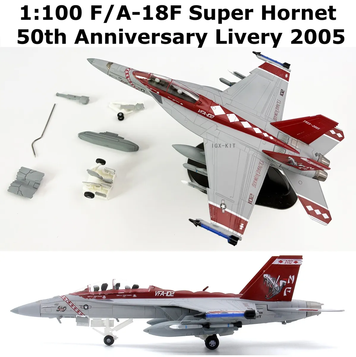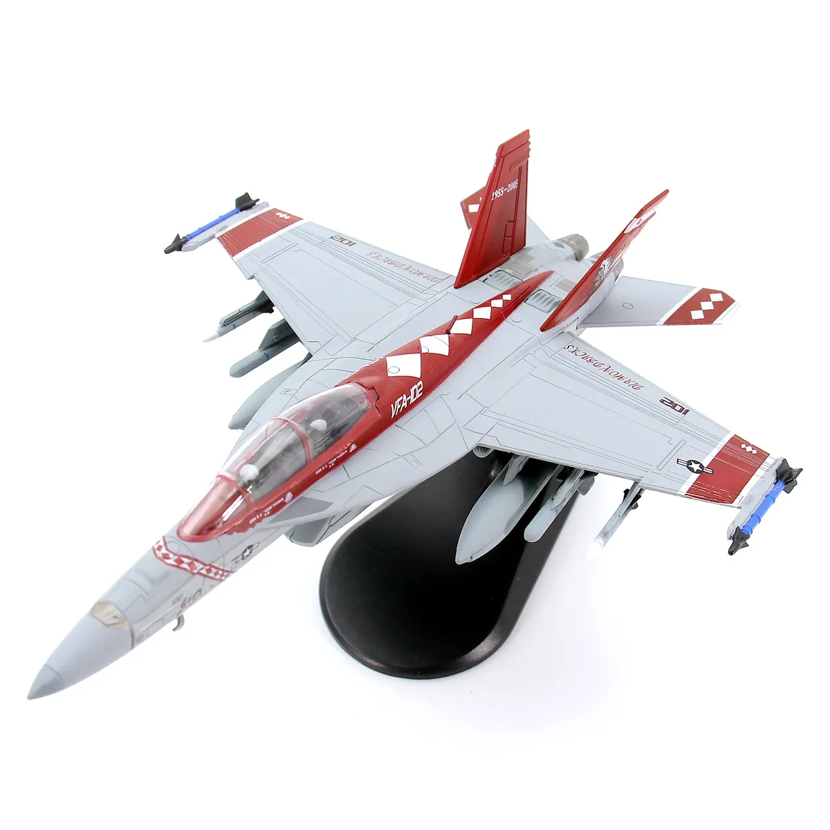 model is replica of Boeing F/A-18F “NF102” Bureau Number 165882 of Strike Fighter Squadron 102 (VFA-102) based at  NAF Atsugi, Japan, Squadron 50th Anniversary 2005