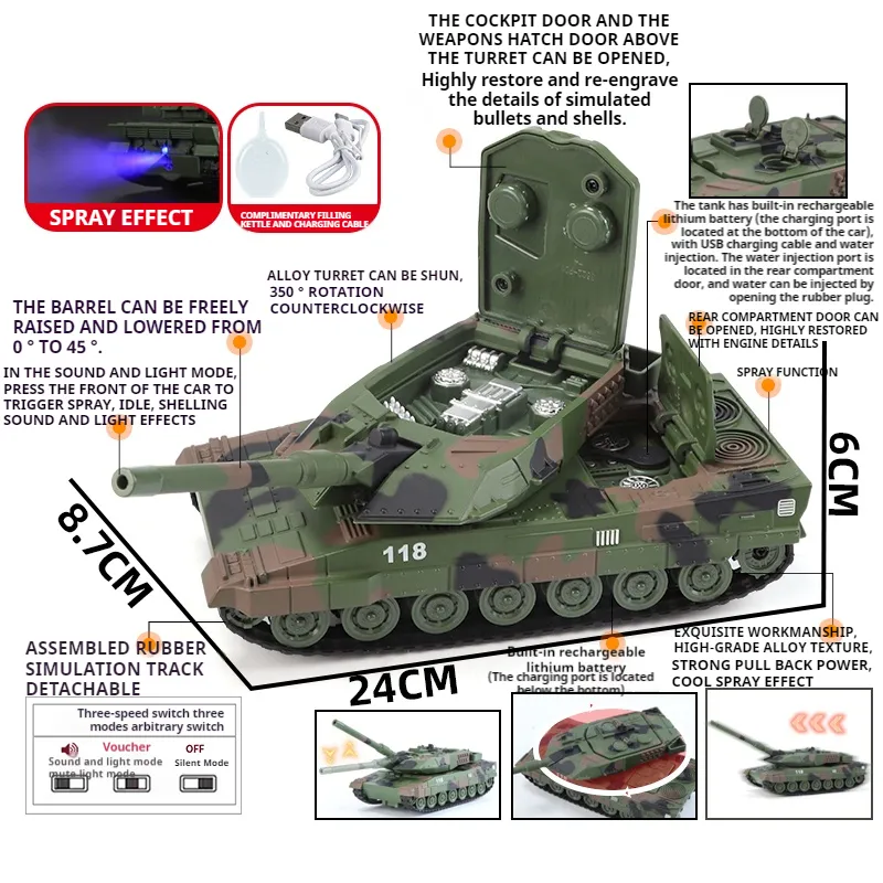 • 3 switch mode: Light & sound effect with spraying real steam smoke