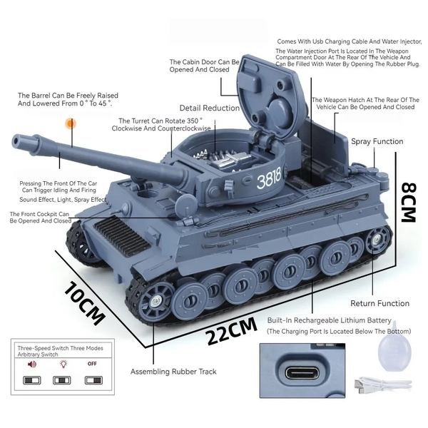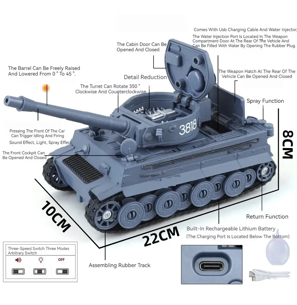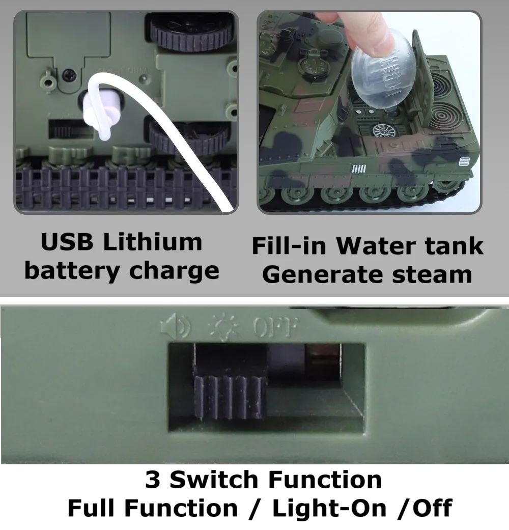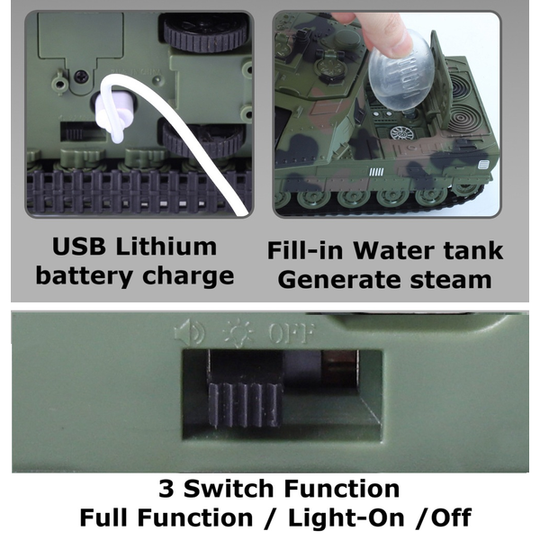 • 3 switch mode: Light & sound effect with spraying real steam smoke