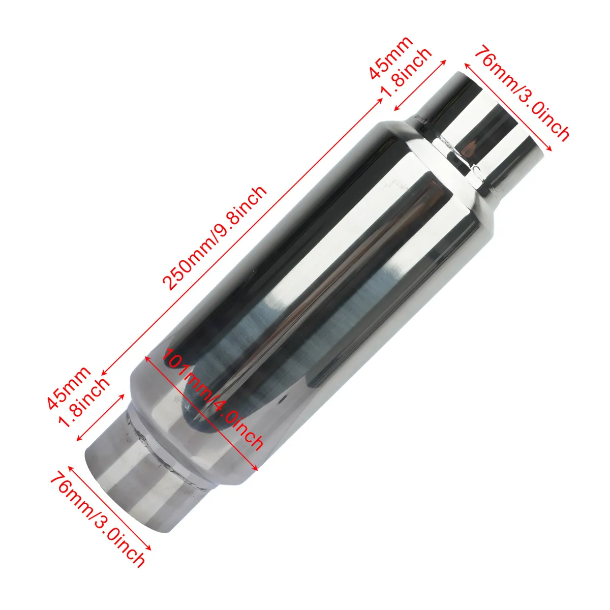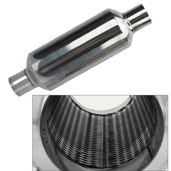 • Straight-through muffler design reduces back pressure while absorbing sound waves Stainless steel internal baffle