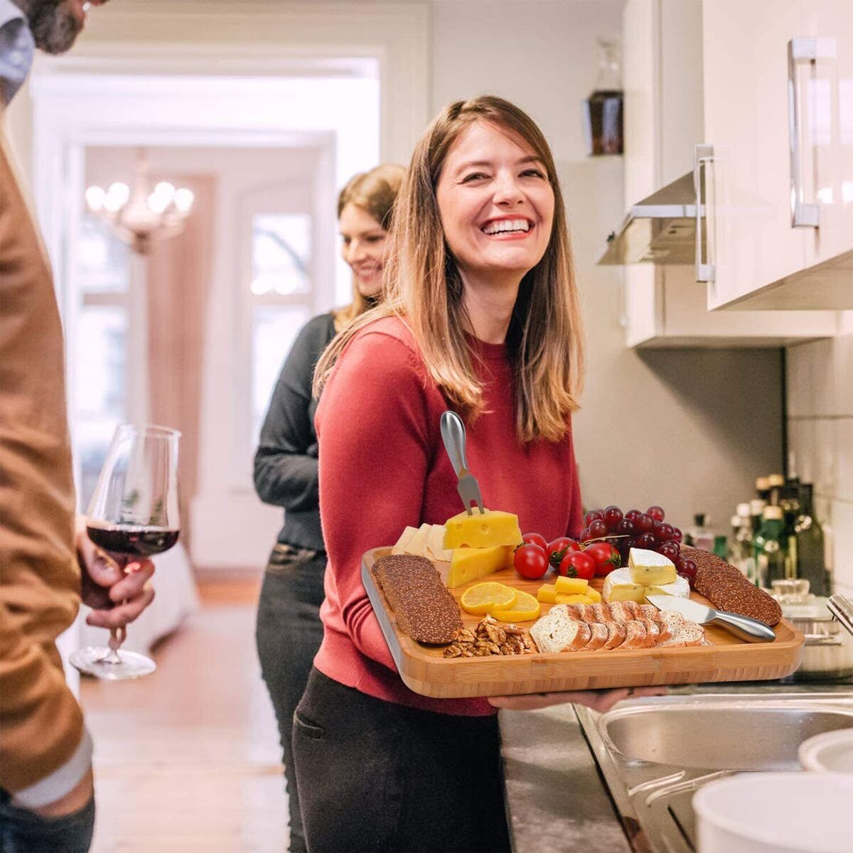 • Extra Large Spaces Serving Board: not only has a large cutting surface but also includes a sizeable groove for presenting your crackers, breads, grapes and chutneys alongside the main attraction. perfect serving board for entertaining guest